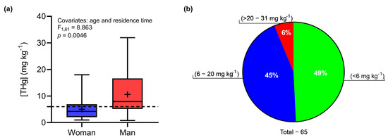 The average THg concentration in the hair of residents of Demarcação was 7.86 ± 6.78 mg kg−1 (0.78–31.97 mg kg−1). An analysis of covariance (ANCOVA) indicated a significant effect of gender (LSM: F1,61 = 8.863; p = 0.0046) on THg concentrations in hair. Women had a mean THg concentration equal to 5.01 ± 3.89 mg kg−1 (0.97–18.02 mg kg−1), while the mean concentration determined in men was 10.62 ± 7.83 mg kg−1 (0.79–31.97 mg kg−1) (Figure 2a). Figure 2b represents the proportions of the THg concentrations in the Demarcação population in relation to limits established by regulatory agencies. Forty-nine percent of individuals (n = 32) had THg concentrations below that established by the WHO (6.00 mg kg−1) [71], with a low probability of harmful effects on the population. However, 44% of individuals presented concentrations above the safe limit, with concentrations close to 20.0 mg kg−1 (n = 29), which could be harmful to human health if not properly controlled. Only 6% of individuals had concentrations above 20.00 mg kg−1 (n = 4). The average MeHg concentration was 5.52 ± 5.42 mg kg−1 (0.40–20.10 mg kg−1), with an average MeHg:THg ratio equal to 67 ± 22% (20–96%, n = 22; 19 women and 3 men).