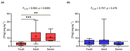 THg concentrations in different age classes in (a) men and (b) women (** p < 0.005; *** p < 0.0005). The dashed line indicates the safe limit recommended by the WHO (6.0 mg kg−1).