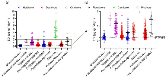 Estimated daily intake (EDI) in nine species among the species most mentioned by the population of the Demarcação District (n = 513 specimens). Graph (a) represents all the EDI values, while graph (b) is a cutout of the EDI values to better visualize their distribution in relation to the PTWI (PTWI/7 = 0.23 μg kg−1), indicated by the dashed line. Different colors are used to differentiate the species by feeding habits.