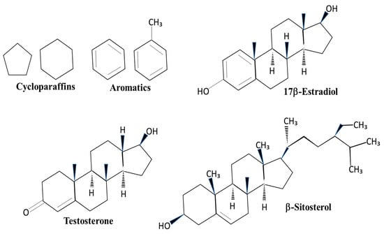 Structures of cycloparaffins, aromatics, and sterol compounds. Cycloparaffin and aromatic structures found in jet fuels are also components of sterol compounds. 17β-Estradiol is a steroid that activates the estrogen receptor. Testosterone is an activator of the androgen receptor. β-Sitosterol is a plant sterol found in the camelina plant.