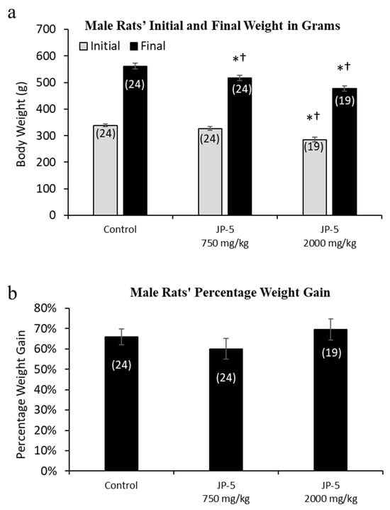 Mean weight gain for male rats with JP-5 exposure. Male rats were exposed by oral gavage to JP-5 for 9 weeks prior to being paired for mating, with exposures continuing until successful mating. (a) Although rats were randomly assigned to experimental groups, the initial mean body weight for the JP-5 2000 mg/kg body weight exposure group (gray bar) had an initial weight average that was significantly lower than both the control group and the 750 mg/kg exposure group (*† p < 0.001). The JP-5 750 mg/kg body weight exposure group had a final average body weight (black bar) that was significantly lower than the control group (* p = 0.007), even though there was no initial statistically significant difference between these groups. The JP-5 at 2000 mg/kg final body weight group (black bar) had final average weights that remained significantly lower than both the control (* p < 0.001) and 750 mg/kg body weight groups († p < 0.010). (b) There were no significant differences between groups when analyzed as mean percentage weight gain over the course of the study. Numbers in parentheses represent n values. Data presented as mean +/− standard error of the mean (SEM).