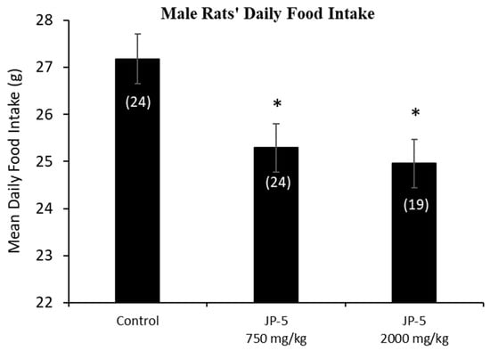 Male rats’ daily food intake during 9 weeks of JP-5 exposure. Mean daily food intake in grams was significantly lower for both JP-5 750 mg/kg group (* p = 0.028) and JP-5 2K mg/kg group (* p = 0.021) when compared to control rats. Numbers in parentheses represent n values. Data presented as mean +/− SEM.
