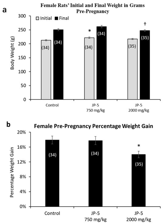 Mean weight gain for female rats with JP-5 exposure pre-pregnancy. Female rats were exposed by oral gavage to jet fuels for 3 weeks prior to mating. Mean weight gain pre-pregnancy was calculated for initial weight and final weight before mating. (a) Animals were randomly assigned to groups for the procedure, with the JP-5 at 750 mg/kg body weight group having initial mean body weights (gray bars) significantly higher than the control group (* p = 0.016). Final post-exposure weight data (black bars) from female rats in the JP-5 2K mg/kg group were significantly lower compared to weight data from female rats in the JP-5 750 mg/kg group († p = 0.028). (b) Percentage weight gain was significantly lower in rats exposed to JP-5 at 2000 mg/kg body weight compared to both control (* p = 0.022) and 750 mg/kg body weight groups († p = 0.02). Numbers in parentheses represent n values. Error values = standard error of the mean.