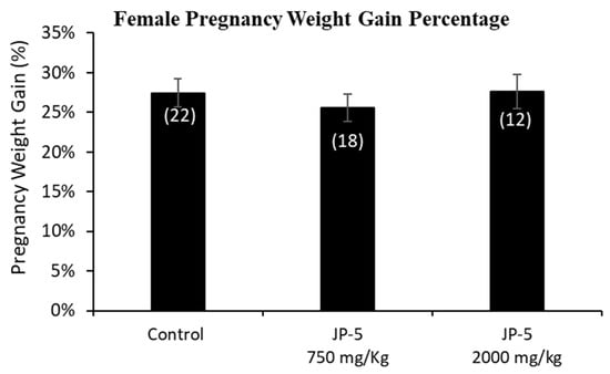 Mean weight gain for female rats with JP-5 exposure during pregnancy. Female rats were exposed by oral gavage to jet fuels during pregnancy. Mean weight gain for pregnancy was calculated for the final pre-pregnancy weight and the weight of the rats after 14 days of pregnancy. Weights at gestation day 14 were normalized to the respective pre-pregnancy weights to assess weight gain. There was no statistically significant effect on pregnancy weight gain resulting from JP-5 exposure (p = 0.687). Numbers in parentheses represent n values. Data presented as mean +/− SEM.