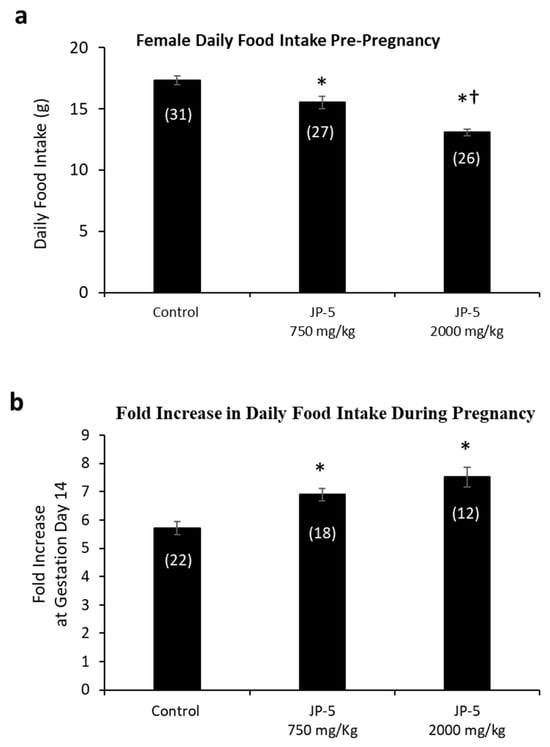Daily food intake for female rats both pre-pregnancy and during pregnancy. (a) Mean daily food intake in grams prior to mating was significantly lower for the JP-5 Low group compared to the control group (* p < 0.001). Female rats in the JP-5 High group showed mean daily food intake that was significantly lower than either the control or the JP-5 Low groups (*† p < 0.001). (b) The fold increase in food intake during pregnancy was significantly higher for the JP-5 750 mg/kg group (* p = 0.002) and the JP-5 2K mg/kg group (* p < 0.001) when compared to the control group. Numbers in parentheses represent n values. Data presented as mean +/− SEM.