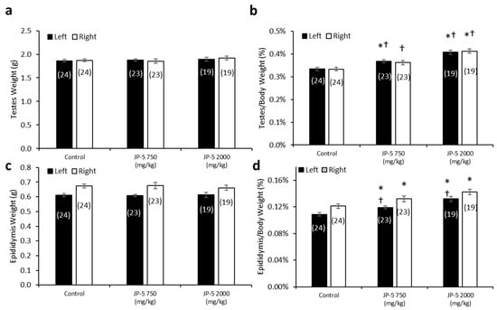 Testis and epididymis weights in male rats exposed to jet fuel via gavage. (a) There were no significant differences found in absolute testis weight among groups. (b) When mean testis weights were normalized to body weights, there was a significant difference across experimental groups. Normalized left testis weights from rats in the JP-5 Low group were significantly larger than those of rats in the control group (* p = 0.005). Normalized left and right testis weights from rats in the JP-5 High group were significantly larger than those from rats in the control (* p < 0.001) or JP-5 Low groups († p = 0.005 (left testis), † p = 0.018 (right testis)). (c) There were no significant differences found in absolute weights of epididymis in rats treated following JP-5 exposure via oral gavage. (d) When epididymis weights were normalized to body weights, there was a significant difference across experimental groups. There was a significant increase in epididymis weight relative to body weight for rats exposed to JP-5 Low compared to control rats (* p = 0.018 (left), * p = 0.049 (right)). Rats exposed to JP-5 High had greater mean percentage of left epididymis weight to body weight that was significantly higher than the averages for both control (* p < 0.001) and JP-5 Low groups († p = 0.005), while the normalized right epididymis weight values were significantly higher than the control group (* p < 0.001). Numbers in parentheses represent n values. Data presented as means +/− SEM.