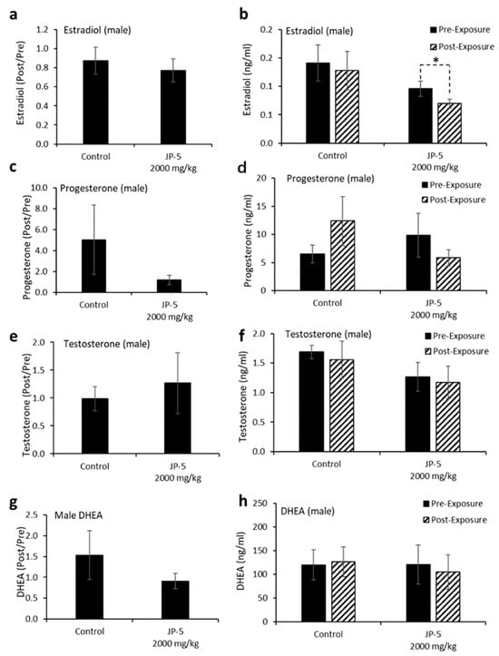 Hormone levels for male rats following JP-5 exposure. Hormone levels were measured as described in Methods. Jet fuel used was JP-5 at either 750 or 2000 mg/Kg body weight. (a) Estradiol levels at post-exposure were normalized to their respective pre-exposure levels. There were no statistically significant differences vs. control for JP-5 exposure (p = 0.45, unpaired t-test, n = 8 control, n = 7 JP-5 High). (b) Absolute estradiol levels were plotted before exposure (black bar) and after exposure (patterned bar). Estradiol levels were decreased at post-exposure compared to pre-exposure levels for JP-5-exposed rats (* p = 0.028, paired t-test, n = 8 control, n = 7 JP-5 High). (c) Progesterone levels at post-exposure were normalized to their respective pre-exposure levels. There were no statistically significant differences vs. control for JP-5 exposure (p = 0.36, unpaired t-test, n = 7). (d) Absolute progesterone levels plotted before exposure (black bar) and after exposure (patterned bar). Trending increase in post-exposure progesterone levels compared to pre-exposure levels in control rats (p = 0.29, paired t-test, n = 7). Trending reduction in post-exposure progesterone levels compared to pre-exposure levels in rats exposed to JP-5 (p = 0.38, paired t-test, n = 7). (e,f) There were no significant differences in the levels of testosterone between the control and JP-5 group when normalized to the respective pre-exposure levels (p = 0.65, unpaired t-test, n = 7) or when compared to their pre-exposure values within the control and JP-5 group (p = 0.64, paired t-test, n = 7). (g,h) There were no significant differences in the levels of DHEA between the control and JP-5 group when normalized to the respective pre-exposure levels (p = 0.91, unpaired t-test, n = 9 control, n = 5 JP-5 High) or when compared to their pre-exposure values within the control and JP-5 group (p = 0.86, paired t-test, n = 9 control, n = 5 JP-5 High).