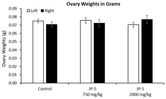 Ovary weights for females after JP-5 exposure. There were no significant differences found in the absolute weights of ovaries across the treatment groups (p = 0.371 for left, p = 0.596 for right ovary).