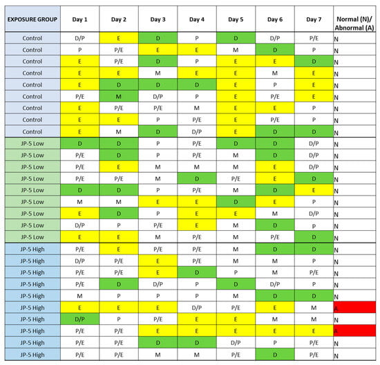 Estrous cycles from vaginal cytology. Analyses were performed as delineated in Materials and Methods. Abnormal cycles of three or more days of estrus phase are noted with “A” in red for abnormal; 100% of Control animals with no jet fuel exposure were found to have normal estrous cycles, as were 100% of animals with “low” 750 mg/kg body weight) jet fuel exposure levels. Animals with “high” (2000 mg/kg body weight) jet fuel exposure levels presented with 20% abnormal estrous cycles. The results indicate a potential trend for jet fuel disruption of normal estrous cycles in rats, but the sample size was not enough to confer statistical significance to the results. Phases noted by single letters are: E = Estrus (yellow); D = Diestrus (Green); M = Metestrus; P = Proestrus.