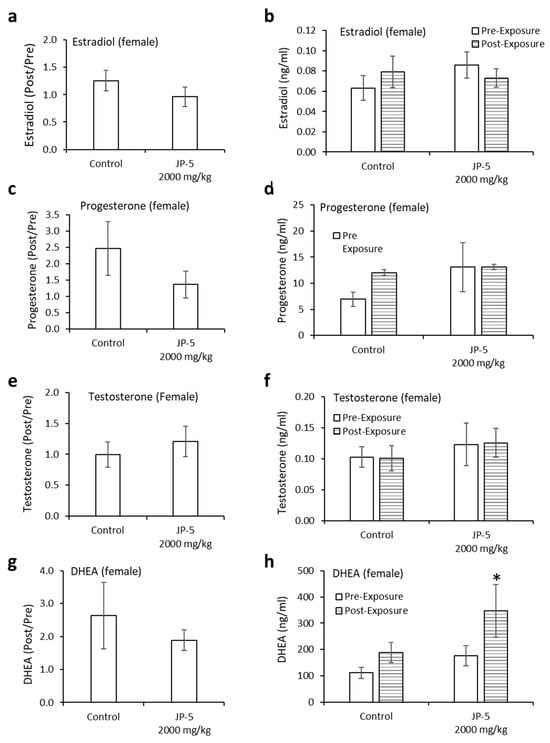 There were slight trending increases in the DHEA levels in female rats compared to the control when data were analyzed as ratios of post- to pre-exposure levels (p = 0.50, two-tailed, unpaired t-test, n = 9) (Figure 12g). Interestingly, there was an increase in the averaged post-exposure value of DHEA compared to the pre-exposure value in the JP-5 2000 mg/kg group (p = 0.049), a difference that was not present in the control group (p = 0.1) (Figure 12h).