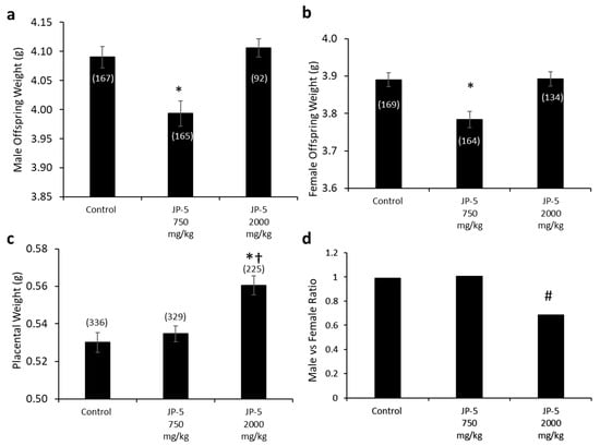 Fetal data for offspring born to rats exposed to jet fuel before mating, with the dams continuing exposure through pregnancy. (a) Average fetal body weight for male offspring was significantly decreased for the JP-5 750 mg/kg group compared to control (* p = 0.035). (b) Average fetal body weight for female offspring was significantly decreased for the JP-5 750 mg/kg group compared to control (* p = 0.008). (c) There was a significant increase in average placental weight for rats exposed to 2000 mg/kg of JP-5 compared to control (* p < 0.001) or JP-5 Low group († p = 0.011). For a-c, numbers in parentheses represent n values and data are presented as mean +/− SEM. (d) The male-to-female offspring ratio was significantly reduced in dams that were exposed to 2000 mg/kg of JP-5 (# p = 0.003).