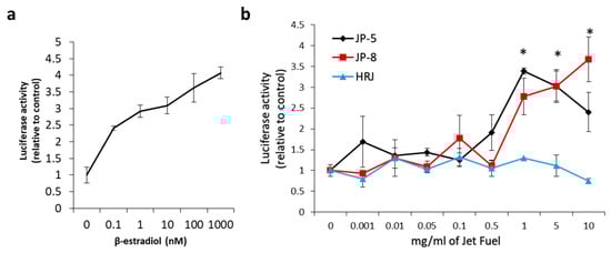 Effects of in vitro jet fuel exposure on human estrogen receptors. (a) 17β-estradiol activation of the estrogen receptor. Results show an expected activation of the estrogen receptor. A human estrogen receptor mammalian expression plasmid, a β-galactosidase expression plasmid, and a luciferase reporter construct plasmid with an estrogen receptor response element were transfected into HEK293 cells and analyzed for ligand stimulation of receptor activities. 17β-estradiol is an endogenous steroid known to activate the human estrogen receptor. Luciferase activity is expressed as fold activation vs. zero concentration control. Results were normalized using the constitutively active β-galactosidase expression plasmid that shows cell viability. Results were also shown to be dependent on the co-transfected estrogen receptor plasmid as a further control. Data presented as mean +/− SEM, with n = 3. (b) Results show that JP-5 (black) and JP-8 jet fuel are capable of activating the human estrogen receptor. Data shown are normalized to control values (0 mg/mL). Statistically significant activation is indicated by an asterisk above the bar in the graph for the JP-5 and JP-8 data (* p < 0.05, one-way ANOVA, Holm–Sidak method vs. 0 mg/mL of JP-5 or JP-8). Data presented as mean +/− SEM, with n = 3 for each jet fuel tested (JP-5, JP-8, HRJ).
