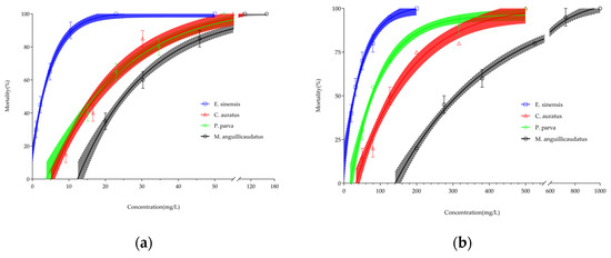 Mortality of M. anguillicaudatus, P. parva, E. sinensis, and C. auratus exposed to (a) As(III) and (b) As(V) for 96 h.