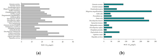 LC50 of arsenic in freshwater organisms. (a) represents the LC50 of As(III), and (b) represents the LC50 of As(V).