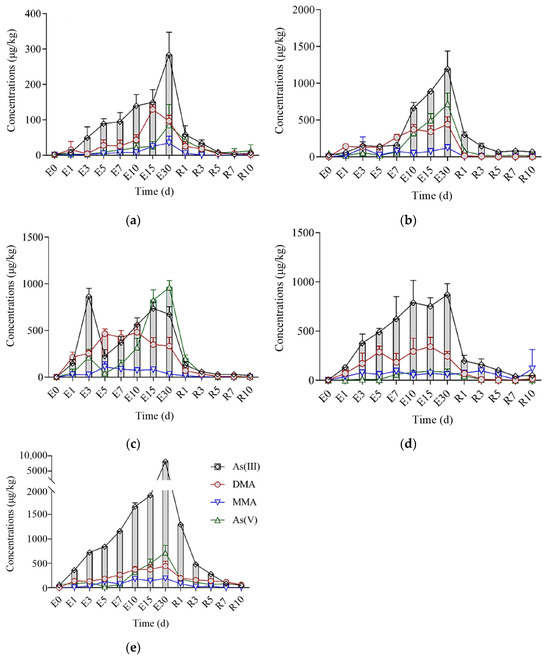After the transfer to clean water, the concentration of MMA decreased to the control group level within 24 h, while DMA, As(III), and As(V) could not be completely metabolized out of the body within 10 days. As(III) metabolism was relatively slow, and the conversion efficiency of As(V) and DMA decreased after the As(III) stress was alleviated.