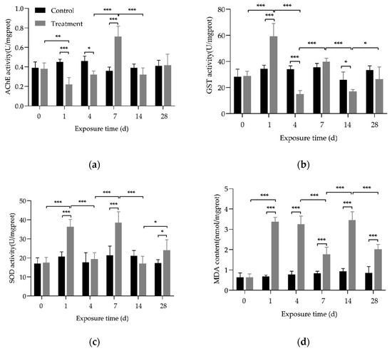 Five fish were collected from both the experimental and control groups for liver enzymatic activity and malondialdehyde (MDA) content measurements on days 1, 4, 7, 14, and 28 of the exposure period. Briefly, the livers were homogenized on ice to ensure sample homogeneity. All commercial assay kits used in this study were purchased from the Nanjing Jiancheng Bioengineering Institute in China. Malondialdehyde (MDA) was measured using the thiobarbituric acid (TBA) and MDA reaction, which was detected using spectrophotometry at 532 nm. Superoxide dismutase (SOD) activity was measured by inhibiting the yellowing rate of the xanthine/xanthine oxidase system in the presence of superoxide anion radicals generated by the oxidation reaction, detected using spectrophotometry at 550 nm. Acetylcholinesterase (AChE) was determined via the hydrolysis of acetylcholine to generate choline and acetic acid. Choline reacts with a chromogenic reagent to produce a yellow Sym-Trinitrobenzene (TNB) product, which is quantified using a spectrophotometric method at a wavelength of 412 nm. Glutathione S-transferase (GST) activity was measured at 412 nm based on the GST-catalyzed reaction between glutathione (GSH) and the substrate 1-chloro-2,4-dinitrobenzene (CDNB) using a glutathione reductase (GR) cycle. The total protein content in individual fish was determined by the reaction between bicinchoninic acid (BCA) and reduced Cu+ using spectrophotometry at 562 nm. Enzyme assays were repeated at least twice. According to the testing method, the sample volume for each assay ranged from 30–100 µL. The homogenate was centrifuged at 3000 rpm for 10 min at 4 °C, and the supernatant was stored at 4 °C. All enzyme assays and MDA content measurements were performed together at the end of the experiment and completed within 12 h.