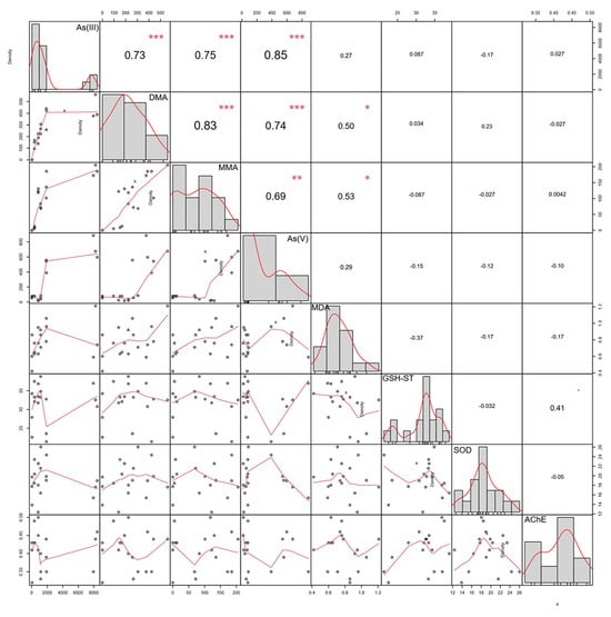 Correlations between enzymatic activity and arsenic species content in the liver of crucian carp chronically exposed to 1 mg/L waterborne As(III) for 28 d. * represents p < 0.05, ** represents p < 0.01, and *** represents p < 0.001.