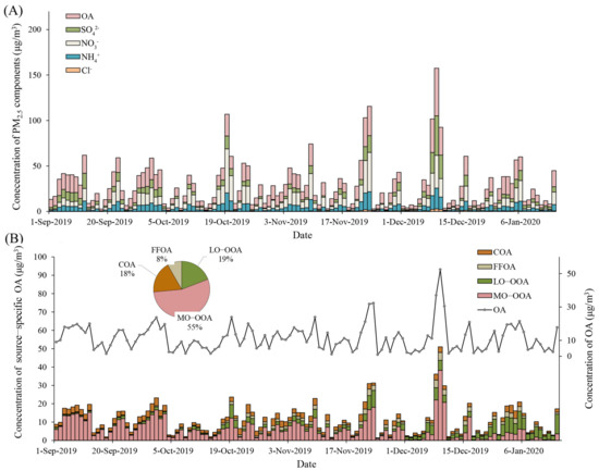 Time series of PM2.5 components (A) and source-specific OA (B). The gray line presented in (B) indicates the characteristics of the OA concentrations during the study period. The organic and inorganic components in PM2.5 were measured at the tower branch site of the Institute of Atmospheric Physics. Abbreviations: PM2.5, particulate matter in diameter < 2.5 μm; OA, organic aerosol; SO42−, sulfate; NO3−, nitrate; NH4+, ammonium; Cl−, chloride; COA, cooking organic aerosol; FFOA, fossil fuel-related organic aerosol; LO-OOA, a less oxidized oxygenated organic aerosol; MO-OOA, a more oxidized oxygenates organic aerosol.
