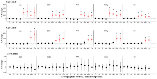 The adjusted percentage changes in ceramides associated with per IQR increment in PM2.5 components. Averaging time represents the mean of PM2.5 component concentrations over the 1 to 72 h (3 days) prior to each participant’s clinic visit. The IQR concentrations for averaged concentration on the full hour of blood draws of OA, SO42−, NO3−, NH4+, and Cl− are 10.4 μg/m3, 5.0 μg/m3, 9.0 μg/m3, 5.0 μg/m3, and 0.2 μg/m3, respectively. Error bars indicated 95% CI. Significant association is shown in red (p < 0.05). Bonferroni corrections with significance (p < 0.0026) are indicated by asterisks. Abbreviations: IQR; interquartile range; PM2.5, particulate matter in diameter < 2.5 μm; Cer, ceramides; OA, organic aerosol; SO42−, sulfate; NO3−, nitrate; NH4+, ammonium; Cl−, chloride.