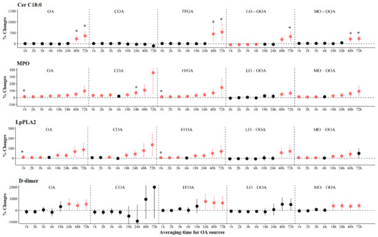 The adjusted percentage changes in selected biomarkers associated with per IQR increment in moving average concentrations of source-specific OA. Averaging time represents the mean of source-specific OA concentrations over the 1 to 72 h (3 days) prior to each participant’s clinic visit. The IQR concentrations for averaged concentration on the full hour of blood draws of OA, COA, FFOA, LO-OOA, and MO-OOA are 10.4 μg/m3, 1.8 μg/m3, 1.1 μg/m3, 2.4 μg/m3, and 6.3 μg/m3, respectively. Error bars indicate 95% CI. Significant association is shown in red (p < 0.05). Bonferroni corrections with significance (p < 0.0026) are indicated by asterisks. Abbreviations: IQR; interquartile range; PM2.5, particulate matter with an aerodynamic diameter smaller than 2.5 μm; Cer, ceramides; MPO, myeloperoxidase; Lp-PLA2, lipoprotein-associated phospholipase A2; OA, organic aerosol; COA, cooking organic aerosol; FFOA, fossil fuel-related organic aerosol; LO-OOA, a less oxidized oxygenated organic aerosol; MO-OOA, a more oxidized oxygenates organic aerosol.