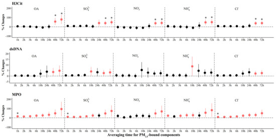The adjusted percentage changes in NETs associated with per IQR increment in PM2.5 components. Averaging time represents the mean of PM2.5 components concentration over the 1 to 72 h (3 days) prior to each participant’s clinic visit. The IQR concentrations for averaged concentration on the full hour of blood draws of OA, SO42−, NO3−, NH4+, and Cl− are 10.4 μg/m3, 5.0 μg/m3, 9.0 μg/m3, 5.0 μg/m3, and 0.2 μg/m3, respectively. Error bars indicate 95% CI. Significant association is shown in red (p < 0.05). Bonferroni corrections with significance (p < 0.0026) are indicated by asterisks. Significant association is shown in red (p < 0.05). Abbreviations: IQR; interquartile range; PM2.5, particulate matter in diameter < 2.5 μm; NET, neutrophil extracellular traps; H3Cit, citrullinated histone H3; dsDNA, double-stranded DNA; MPO, myeloperoxidase; OA, organic aerosol; SO42−, sulfate; NO3−, nitrate; NH4+, ammonium; Cl−, chloride.