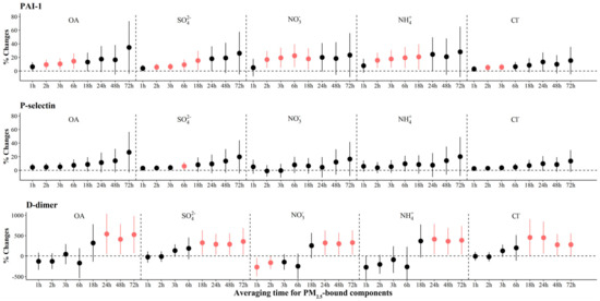 The adjusted percentage changes in coagulation biomarkers per IQR increment in PM2.5 components. Averaging time represents the mean of PM2.5 component concentrations over the 1 to 72 h (3 days) prior to each participant’s clinic visit. The IQR concentrations for averaged concentration on the full hour of blood draws of OA, SO42−, NO3−, NH4+, and Cl− are 10.4 μg/m3, 5.0 μg/m3, 9.0 μg/m3, 5.0 μg/m3, and 0.2 μg/m3, respectively. Error bars indicate 95% CI. Significant association is shown in red (p < 0.05). Abbreviations: IQR; interquartile range; PM2.5, particulate matter in diameter < 2.5 μm; PAI-1, plasminogen activator inhibitor-1; OA, organic aerosol; SO42−, sulfate; NO3−, nitrate; NH4+, ammonium; Cl−, chloride.