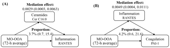 Mediation analyses of ceramides on inflammation biomarkers (A) and inflammation biomarkers on coagulation biomarkers (B) following PM2.5 components and source-specific OA exposure. Averaging time represents the mean of source-specific concentrations over the 1 to 72 h (3 days) prior to each participant’s clinic visit. Abbreviations: PM2.5, particulate matter in diameter < 2.5 μm; MO-OOA, a more oxidized oxygenates organic aerosol; RANTES, regulated upon activation normal T cell expressed and secreted; PAI-1, plasminogen activator inhibitor.