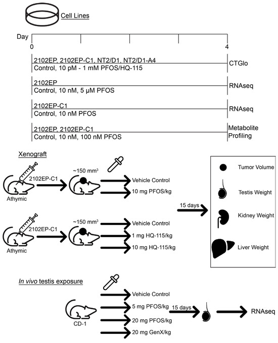 The human embryonal carcinoma cell lines 2102EP and NT2/D1 were purchased from ATCC (Manassas, VA, USA) and authenticated by ATCC by means of karyotyping and short tandem repeat profiling. The 2102EP-C1 and NT2/D1-A4 cells are isogenic-derived cisplatin-resistant clones of 2102EP and NT2/D1 and described previously [31]. These cisplatin-resistant cells were included as we have previously shown that their cisplatin resistance is driven by epigenetic alterations which is a suspected mechanism of PFAS action [13,31]. Cisplatin is the main treatment for TGCTs and cisplatin resistance is a clinical problem [15]. Cells were maintained in Dulbecco’s Modified Eagle Medium with 10% fetal bovine serum (GeminiBio, Sacramento, CA, USA), 1% antibiotic/antimycotic (Corning, Corning, NY, USA), and 1% L-glutamine (Corning, Corning, NY, USA). For cell proliferation/survival assays, an equal number of cells were plated in 96-well plates in three biological replicates at 20,000 cells per well. On the next day, the cells were treated with PFOS (Sigma, St. Luis, MO, USA), HQ-115 (Sigma, St. Luis, MO, USA), or vehicle control (DMSO), and viable cell numbers were estimated 3 days later using the CellTiter-Glo assay (Promega, Madison, WI, USA). PFOS is a legacy PFAS and HQ-115 is a newer, “clean energy” PFAS. Both compounds were used in cell proliferation assays at doses ranging from 10 pM to 1 mM. A schematic of all experimental protocols in this proposal is provided in Figure 1.