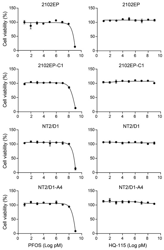 PFOS and HQ-115 are not acutely toxic and do not alter the proliferation of TGCT cells in vitro. TGCT cells lines 2102EP, 2102EP-C1, NT2/D1, and NT2/D1-A4 were treated with 10 pM to 1 mM doses of PFOS and HQ-115 for 4 days, and cell viability was assessed. Cell viability (%) is the CellTiter-Glo signal compared to untreated vehicle control. Data represent mean +/− standard error of the mean of four biological replicates, and are representative of two independent experiments.