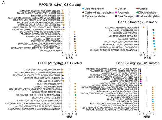 We performed an RNA-seq expression analysis of mouse testes after 15-day daily oral dosing of PFOS at 5 mg/kg and 20 mg/kg body weight. We also performed RNA-seq on mouse testes after 15-day daily oral dosing with the second-generation PFAS, GenX. Robust and consistent transcriptional changes were evident in PFAS-treated testes compared to control testes. We then performed gene set enrichment analysis (GSEA) against the C2 gene sets from the MSigDB database. Within the top 15 PFOS and GenX up- and downregulated gene sets, as determined by normalized enrichment score (NES), PFOS and GenX treatments consistently downregulated gene sets associated with the H3K27me3 mediated polycomb pathway and altered gene sets associated with DNA methylation (Figure 4 and Supplemental Table S1). We have previously shown that the polycomb pathway and DNA methylation are interconnected and reciprocally regulated epigenetic pathways associated with the survival of TGCT cells under stress conditions [31,40,41]. Several other cancer-related pathways were altered by PFOS and GenX within the top 15 regulated gene sets including those involved in hypoxia, apoptosis, DNA damage, and cancer tumorigenesis and metastasis (Figure 4 and Supplemental Table S1). Interestingly, alterations in gene sets associated with fatty acid and cholesterol metabolism were seen especially with GenX when assessing the MSigDB Hallmark database (Figure 4 and Supplemental Table S1). Previously, PFAS have been suggested to function as fatty acid mimics based on their similarity of structure, and regulate fatty acid steroid metabolism including acting as ligands for peroxisome proliferator-activated receptors (PPARs) [7,42,43].