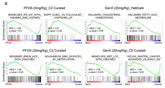 PFOS and GenX alter gene expression associated with fatty acid and steroid synthesis and metabolism, H3K27me3, DNA methylation, and other pathways associated with pro-cancer phenotypes in mouse testes. Results of the RNA-seq analysis of mouse testes after oral treatment with 5 mg/kg and 20 mg/kg per body weight of PFOS or 20 mg/kg per body weight of GenX for 15 consecutive days compared to vehicle control. (A) Gene set enrichment analysis (GSEA) of gene sets among the top 15 ranked by normalized enrichment score (NES) altered by PFOS or GenX treatments. Complete lists are in Supplemental Table S1. (B) Representative gene set enrichment plots.