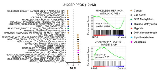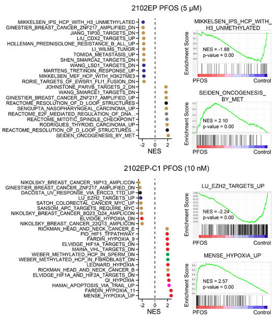 A transcriptomic analysis was also performed with 2102EP cells treated acutely with 10 nM and 5 µM PFOS and 2102EP-C1 cells treated with 10 nM PFOS for 4 days in vitro. Similar to the PFAS-mediated changes in mouse testes, there were a consistent downregulation of gene sets associated with the H3K27me3 mediated polycomb pathway and an alteration in gene sets associated with DNA methylation, as well as alterations in cancer pathways associated with tumorigenesis, apoptosis, hypoxia, and DNA repair (Figure 5 and Supplemental Table S2).