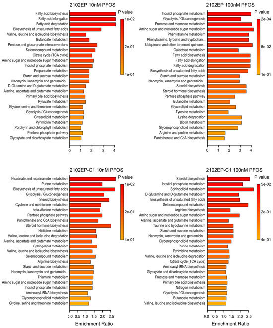 A GC-MS metabolite profiling analysis was then conducted on 2102EP and 2102EP-C1 cells treated with 10 nm and 100 nm of PFOS for 4 days. The principal component analysis (PCA) clearly separated PFOS-treated biological replicates from controls (Supplemental Figure S1). Several metabolites were substantially and consistently altered in PFOS-treated cells compared to controls, many of which were related to fatty acid metabolism, including 4-hydoxybutanoic acid, palmitic acid, oleic acid, 1-monooctadecanoylglycerol, and stearic acid (Supplemental Figure S2 and Table S3). Since PFOS and other PFAS are suspected fatty acid mimics and proposed ligands for nuclear receptors that regulate fatty acid metabolism including PPAR-α, we next performed a pathway enrichment analysis [7,42,43]. In agreement with our transcriptomic results, the most significant and consistent pathways regulated by PFOS in TGCT cells were related to fatty acid homeostasis and steroid biosynthesis (Figure 6 and Figure 7, Supplemental Table S4). Together, the data suggest that the pro-cancer effects of PFOS on TGCTs may in part be mediated by the cell-intrinsic regulation of fatty acid metabolism.