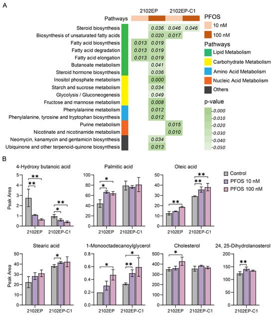 PFOS alters metabolite products associated with fatty acid and steroid biosynthesis in TGCT cells. 2102EP and 2102EP-C1 cells were treated for 4 days with 10 nM and 100 nM PFOS. (A) Compilation of most commonly significantly enriched metabolic pathways as performed with MetaboAnalyst 5.0 across cell lines and treatments. (B) Univariate analysis demonstrating significantly altered fatty acid-related metabolites upon PFOS treatments. Metabolite units are in peak area adjusted for internal standard. Data represent mean +/− standard error of the mean. * p ≤ 0.05, ** p ≤ 0.01.