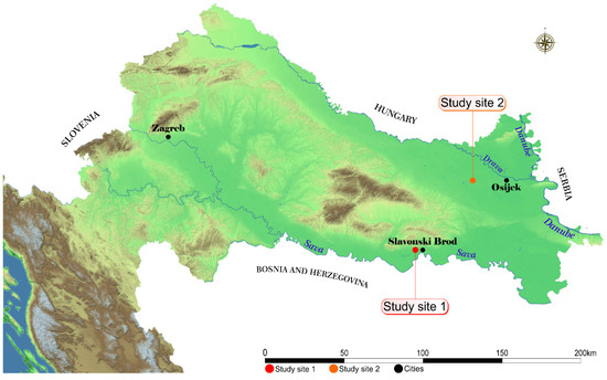 Regurgitated pellets were obtained from white stork nests during the breeding season in June and July 2020. In total, 20 pellets were collected and analysed from two sampling areas (Figure 1). Each pellet represented one nest. Pellets from selected nests for sampling in Study Site 1 (n = 10) lay along the Sava River, just downstream from an urban centre (Slavonski Brod) known for its highly developed metal engineering industry. The nests are surrounded by agriculture, small villages, alluvial forests and pastures regularly flooded by Sava. Furthermore, an oil refinery is situated at Bosanski Brod, which is adjacent to the town of Slavonski Brod. Pellets sampled from nests in Study Site 2 (n = 10) were located in small villages, surrounded by large grassland pastures, meadows, arable land and woodland habitat.