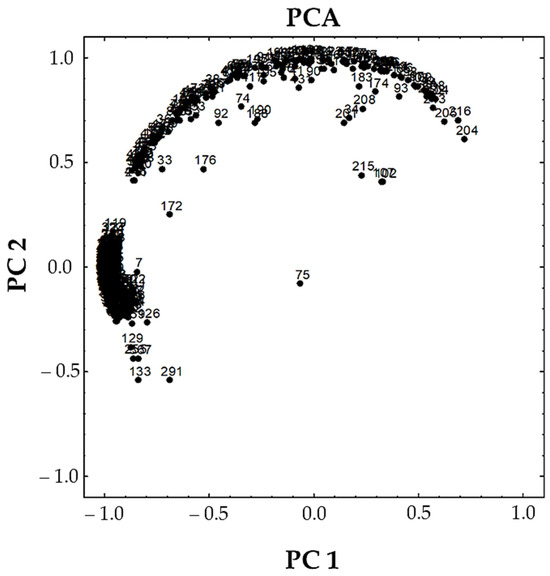 We detected substances associated with plastic masses, which are shown in Table 1. Out of 7869 isolated particles, we detected polymers associated with plastic masses in 519 particles, namely, in Study Site 1, 321 (4.23%) particles and, in Study Site 2, 198 (49.38%) were associated with plastic masses. PCA analysis was performed on 499 spectra. The results showed similarities among samples collected from different locations. The results of PCA showed that two principal components account for 80% of the total variance in the data (Figure 3).