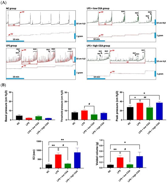 (A) Depicts micturition cycle patterns for different mouse groups: Normal Control (NC), lipopolysaccharide (LPS), LPS + low CGA, and LPS + high CGA. Cystometric recordings present micturition pressure, frequency, voiding episodes, and non-voiding contractions (NVC). Lower trace recordings illustrate voiding volume per urination event, offering insights into distinct micturition cycle patterns. (B) Provides a comprehensive representation of cystometric parameters, including basal pressure, threshold pressure, peak pressure (PP), intercontraction interval (ICI), and voided volume (VV). Parameters were computed for NC, LPS, LPS + low CGA, and LPS + high CGA groups. LPS + low CGA—(60 µg/mL); LPS + high CGA—(750 µg/mL). Mean values with corresponding standard errors of the mean (SEM) are presented, indicating significant differences (* p < 0.05, ** p < 0.01, # p < 0.05, ## p < 0.01). This visual aid offers valuable insights into variations in cystometric parameters among the experimental groups (n = 8 animals/group).