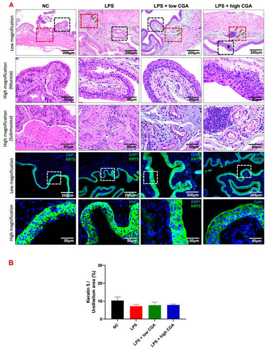 (A) H&E-stained and immunofluorescent staining patterns of bladder sections from various mouse groups: normal control (NC), lipopolysaccharide (LPS), LPS + low CGA, and LPS + high CGA. Compared to the NC group, the LPS group displays inflammation in the submucosa (indicated by the red-delineated area) and a thickened urothelial layer (indicated by the black-delineated area) due to inflammation (the black (urothelium) and red (submucosa) delineated areas were correspondingly magnified). In contrast, the LPS + low CGA group exhibits no alteration, manifesting as a normal phenotype of the urothelium attributed to CGA-mediated recovery. Conversely, the * symbol denotes the LPS + high CGA group, which exhibits partial abnormal thickening of the bladder urothelium but shows no significant difference compared to NC. Keratin-5 (K5) staining visualized cytoplasmic intermediate filament proteins within urothelium tissues (white delineated area), with no significant damage detected in the urothelium compared to the NC group. (B) Quantification results of K5 indicate that LPS-treated mice have shown no significant damage detected within urothelial tissues (the white delineated area was magnified correspondingly). LPS + low CGA—(60 µg/mL); LPS + high CGA—(750 µg/mL); Black dotted square: high magnification of mucosa; red dotted square high magnification of submucosa). Magnification: Low: 50, high: 100× and higher: 200×; Scale bar: 100 and 200 μm; n = 8 animals/group.