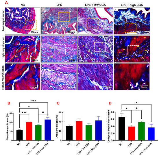 The LPS-induced group revealed irregular muscle skeleton arrangement and a significant augmentation in collagen content in the interstitial layer detrusor muscle layer (Figure 3C). The low CGA group slightly attenuated the pathological development of the bladder wall. In contrast, the LPS + high CGA group presented more severe detrusor hyperplasia and collagen deposition of fibrosis conditions (Figure 3D). These results indicate that a high CGA might have harmful effects on bladder tissue, emphasizing the importance of dosage considerations in treatment applications.