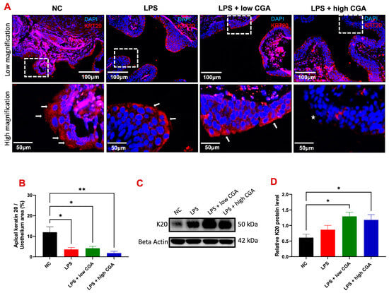 Our objective was to investigate if direct exposure of CGA to the bladder has any adverse effects on this crucial defense barrier. In the NC group, an intact apical K20 signal was observed by immunofluorescence, indicating an intact urothelium without apparent damage (Figure 4A). LPS and low CGA treatment showed less K20 expression in mature umbrella cells of the urothelial layer. However, a very weak apical K20 signal in the urothelium was observed in the high CGA group compared to all groups (denoted by *) (Figure 4B). These results demonstrate that the acidic properties of high CGA can adversely affect the bladder mucosa. It needs to be noted that LPS treatment causes a slight increase in total K20 protein in the bladder, but CGA stimulation significantly increases the signal expression of total K20 in the bladder urothelium and lamina propria (Figure 4C,D).