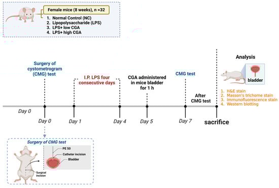 Following a 4-day LPS treatment protocol, the experimental mice received 250 µL of low-concentration (60 µg/mL) and high-concentration (750 µg/mL) CGA injected directly into the bladder from the apex dome. CGA was retained in the bladder for 1 h. This precise delivery was achieved by utilizing a PE 50 tube directly connected with the assistance of a syringe injector. Subsequent to the CGA instillation, a comprehensive analysis of bladder function was conducted, employing CMG measurements. To comply with the Institutional Animal Care and Use Committee (IACUC) guidelines and minimize animal usage, there are limitations on administering the medium dose in the upcoming experiment.
