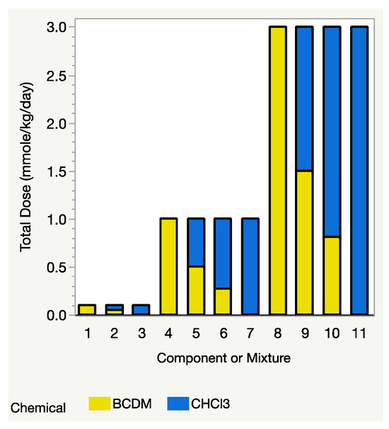 From Equation (3), as mentioned above, the Prop-RA model requires estimated response values for each component at the same dose level, D. If one of the mixture’s total dose levels, say D1, is much higher than the highest dosage in the data for one of the components, then that component’s estimated response at dosage D1 must be extrapolated using a dose–response model for that component. When components have substantially different potencies, that extrapolation can be extreme or even impossible (for details and an example, see Section 4.2 “Complications of Total Dose in the Prop-RA Formula”). The THM study avoids such extrapolation by having the mixture and all four components tested at the same dose levels. For example, the binary mixture study of CHCl3:BDCM included three mixture dosages (0.1, 1.0, and 3.0 mmol/kg/day), with each component tested at those same three levels, i.e., it has a design with a common dose level across the components and the mixture (Figure 1). Each of the binary mixture experiments followed a similar concept, so no extrapolation was necessary. In fact, because each component was tested at the same dose levels as the mixture’s total dose, the single chemical data could be used directly in the Prop-RA formula to calculate a predicted mean response for the mixtures and then used to compare those predicted values with the observed means from the mixture data.