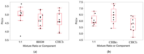 Data on percent relative liver weight (PcLiv) show fairly consistent variance over the components and mixture. (a): CHCl3, BDCM, and the mixture (1:1 ratio) at dosage = 0.1 mmol/kg/day. (b): CHCl3, CHBr3, and the mixture (1:1 ratio) at dosage = 1.0 mmol/kg/day. Note: the vertical dimension of each outlier box shows the interquartile range with the horizontal line in the box denoting the median; the dots are jittered data points.