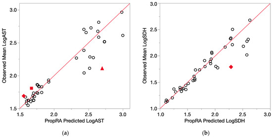 Consistency of data with the Prop-RA prediction for LogAST and LogSDH. Circles indicate concordance between data and Prop-RA prediction. Filled-in symbols denote statistically significant departure from the Prop-RA prediction for that dose–mixture combination. The red 45-degree line is added to show concordance; it is not a linear regression. (a) LogAST = log10(AST). Rhombus: shows a statistically significant departure from Prop-RA for binary combination CHCl3:CDBM (dosage = 0.1 mmol/kg/day, mixing ratio = 1:1). Square: shows statistically significant departure from Prop-RA for binary combination CHCl3:BDCM (dosage = 1.0 mmol/kg/day, mixing ratio = 2.7:1). Triangle: shows statistically significant departure from Prop-RA for binary combination CDBM:CHBr3 (dosage = 3.0 mmol/kg/day, mixing ratio = 10:1). (b) LogSDH = log10(SDH). Rhombus: shows a statistically significant departure from Prop-RA for binary combination BDCM:CHBr3 (dosage = 3.0 mmol/kg/day, mixing ratio = 1:1).