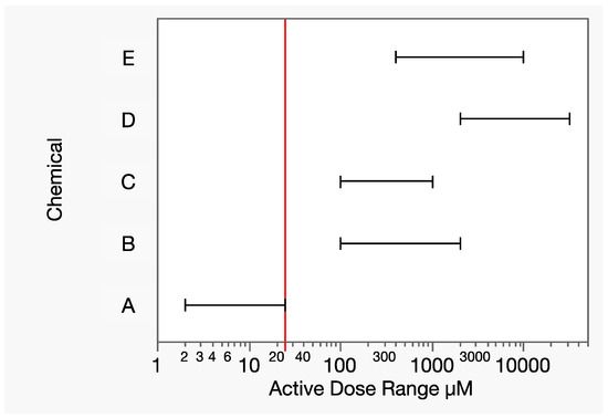 Dose ranges (horizontal line segments, excluding controls) of the hypothetical chemicals A–E for a given response of interest. The vertical line is the lowest maximum component dose level (25 µM), that of chemical A, at which 100% response was experimentally observed. There is no dose range overlap of chemical A with any other component, forcing an estimated response level based on possibly extreme extrapolation.