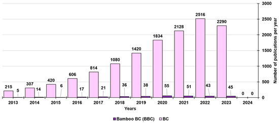 However, to safeguard the environment from BC-related PFRs’ potential adverse effects, it is necessary to comprehensively and systematically consider their environmental risks, formation mechanisms, and controlling factors [27], as well as the corresponding possible mitigation actions. Studies have shown that the type of biomass feedstock used to produce BC is pivotal in determining the physicochemical properties of the resulting BC, which also strongly affect the formation and characteristics of PFRs. To date, the types of biomasses used to prepare BC and involved in the investigation of BC-bound PFRs mainly include lignocellulosic biomasses (hemicellulose, cellulose, and lignin) from sources such as pine needles, wheat straw, lignin, cow manure, rice husk, and maize straw [38,39,40]. Additionally, cow dung (CD), sheep manure (SM), lotus stem (LS), and eggshell (ES) biomasses, representative of farm wastes, have been reported to provide BC containing PFRs [41]. Bamboo is an emerging starting material that is perfect for synthesizing BC and activated carbon (AC) due to its inexpensive cost, high biomass yield, and accelerated growth rate [42,43]. However, only a few researchers and scientists have used bamboo as a unique source for developing BC so far, as established by the number of publications on bamboo-derived BC developed in the last ten years (current year excluded) (331) vs. those on BC derived from different sources (13,630) (Figure 2).