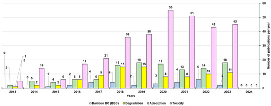Number of publications on bamboo-derived BCs, as well as their absorption, degradation, and toxic properties, published in the last ten years (current year excluded) according to the PubMed dataset. The survey was carried out using the following keywords: bamboo biochar (pink bars); bamboo biochar AND adsorption (green bars); bamboo biochar AND degradation (yellow bars); bamboo biochar AND toxicity (light blue bars).