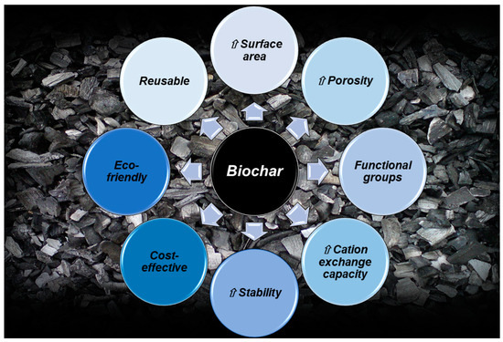 BC obtained by the combustion of various biomasses, as reported in Table S1, has been demonstrated to possess unparalleled physicochemical properties such as a large surface area, high porosity, the presence of several functional groups, high cation exchange capacity (CEC), long-term stability, etc. (Figure 4). Such properties make BC suitable for various applications, including, but not limited to, carbon sequestration, soil amendment, energy storage, and catalysis [67,68,69,70,71,72,73,74,75] (Table S1). Additionally, BC is cost-effective, has an eco-friendly nature, and is endowed with reusability (Figure 4) [76,77]. Mainly, BC is increasingly gaining attention from many researchers as a material to efficiently remove various environmental contaminants, including antibiotics, thus reducing the emergence of microbial resistance [72,74].