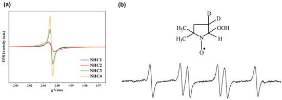 Unlike other free radicals, PFRs are resonance-stabilized since they are bound to the external or internal surface of solid particles of BC. They can be analyzed by electron paramagnetic resonance spectroscopy (EPR) [25]. Figure 7a provides an example of an EPR analysis of the PFRs present on a solid N-doped hydro char prepared in a tube furnace at a temperature of up to 600 °C for 1 h under a N2 atmosphere [127].
