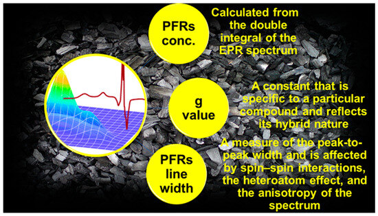 Unlike the PFRs discussed previously, PFRs formed inside the matrix of organic moieties are not related to the presence of transition metals [139]. Still, they are highly dependent on the relevant organic matter, while their concentration is significantly and positively correlated with the elemental carbon content [139]. In this case, PFRs are compared in terms of thermally treated particles, for which the breaking of chemical bonds in the precursor molecules during pyrolysis is the primary reason. At the initial pyrolysis stage, the homolytic cleavage of weak linkage bonds like the α- and β-alkyl aryl ether bonds, C-C, and C-O linkage resulted in the forming of free radicals in BC. The outer-surface free radicals would rapidly react and dissipate, resulting in a decrease in EPR signals. The free radical concentrations then increased with extended pyrolysis and during the cooling stage, thus accumulating many free radicals on the BC’s surface [139] and dramatically boosting the EPR signals. The free radicals formed in the matrix of the produced BC are probably protected from reacting with each other or other chemicals and are thus stabilized.